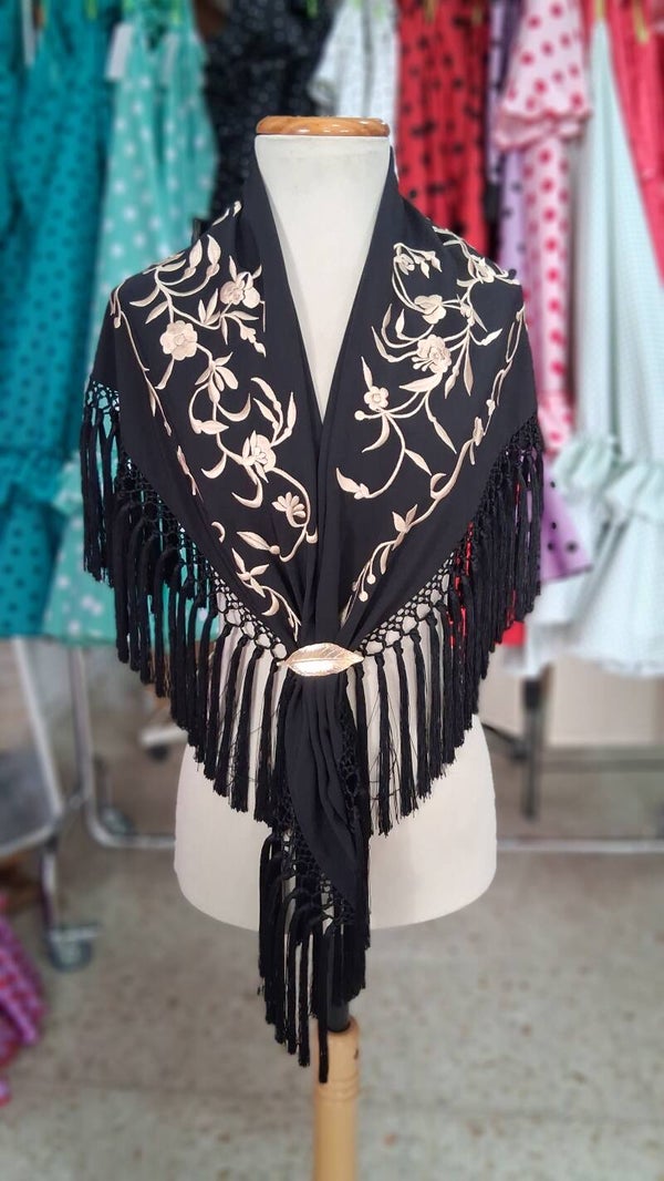 Mantón bordado negro con flores doradas, enrejado a mano, fleco corto con borlones.