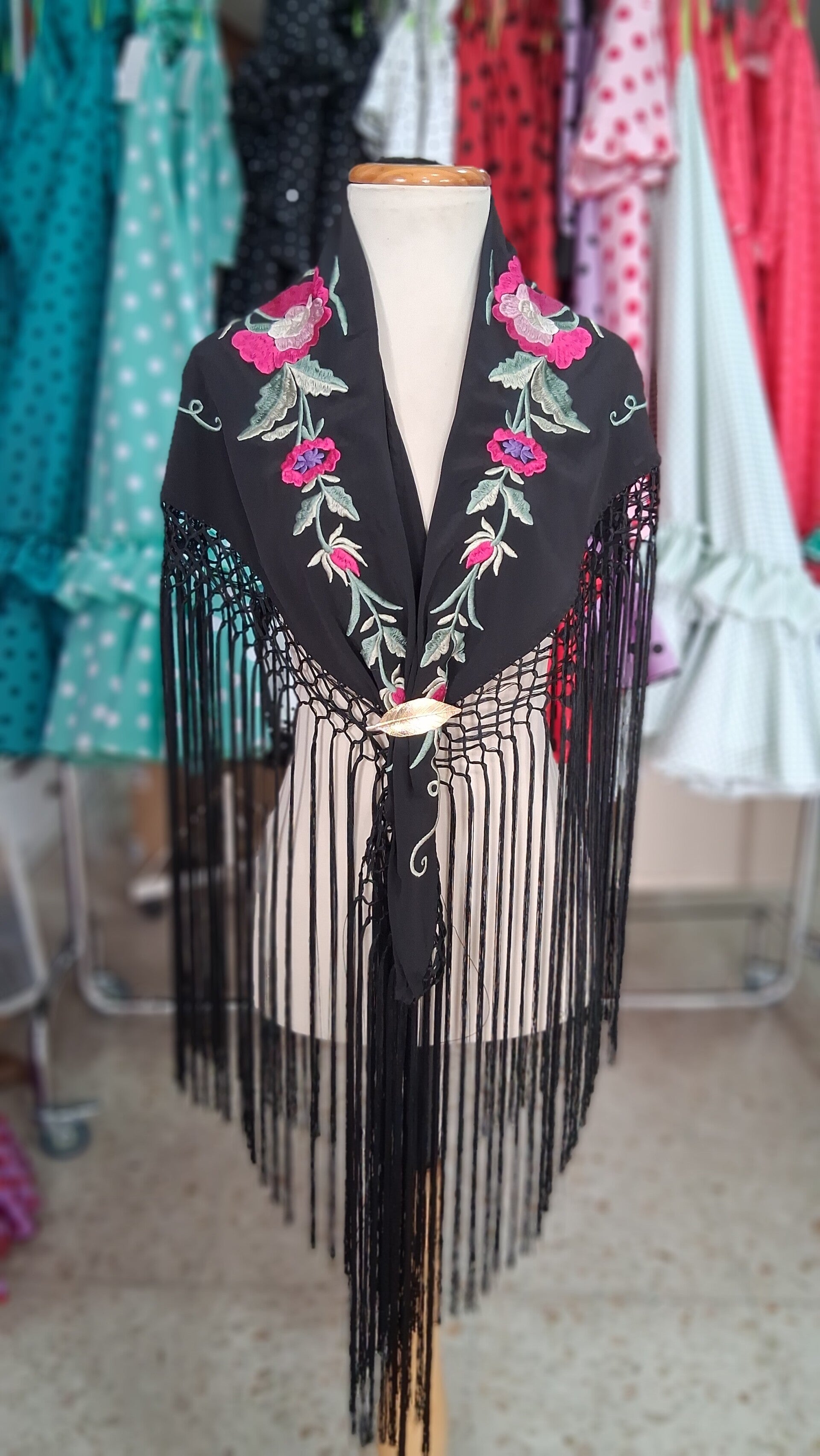 Mantón bordado negro con flores fucsia, fleco largo, enrejado a mano.