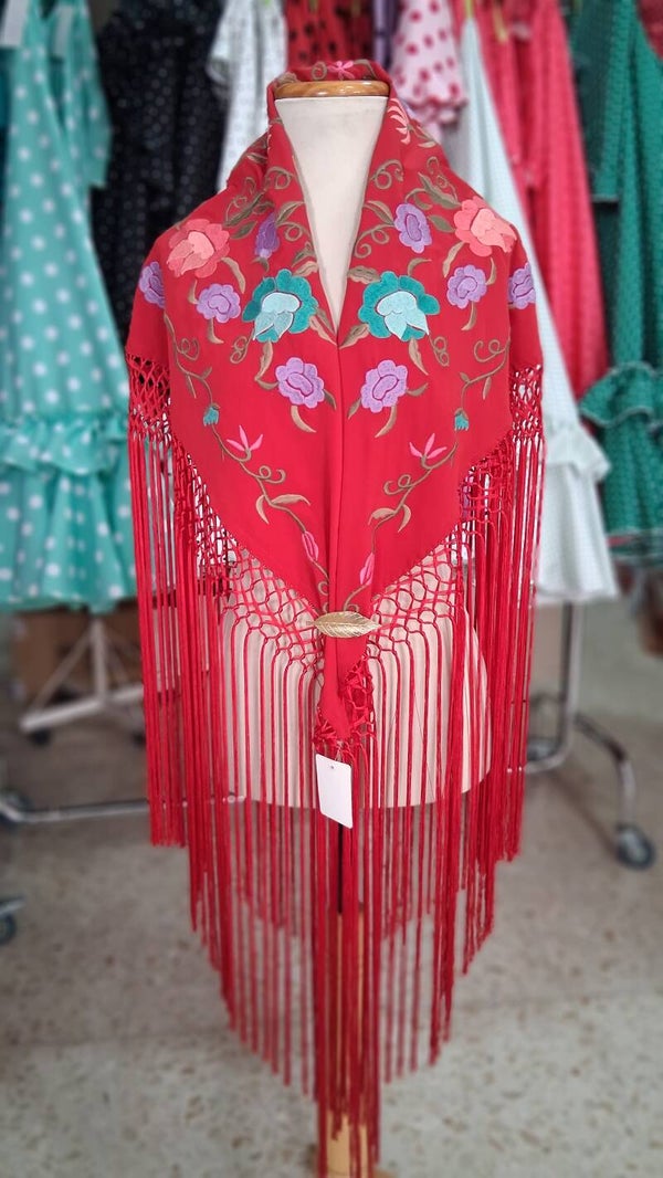 Mantón rojo bordado flores colroes, fleco largo
