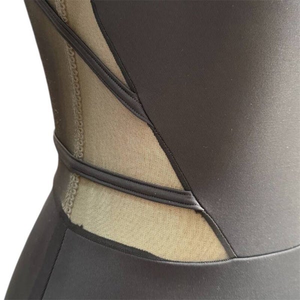 Su diseño combina vivos y transparencias en la espalda, las mangas y la cintura, aportando un toque moderno y femenino.